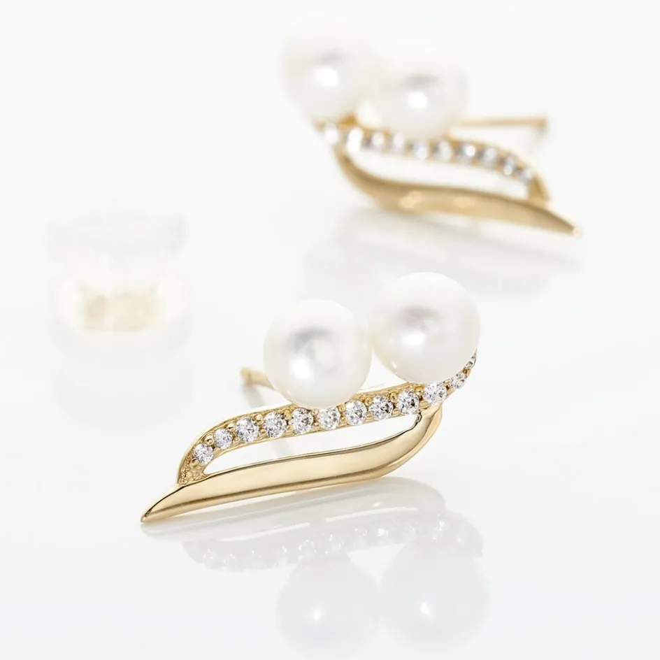 Boucles D’oreilles Or Jaune 375/1000 Formes Vagues Perles De Culture 4mm Et Oxydes De Zirconium