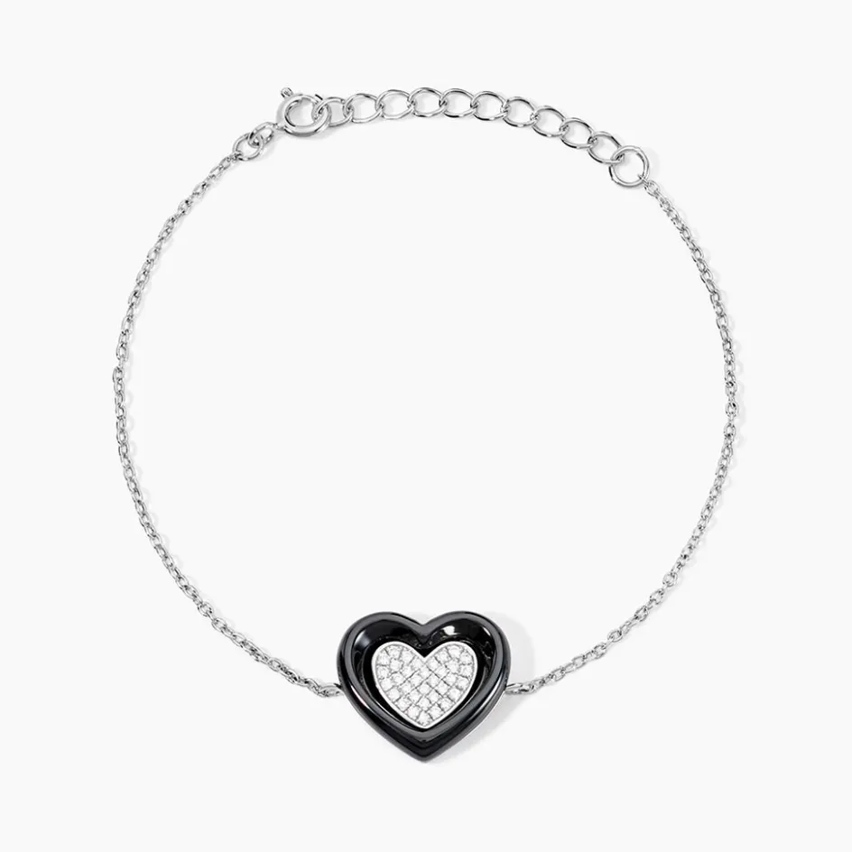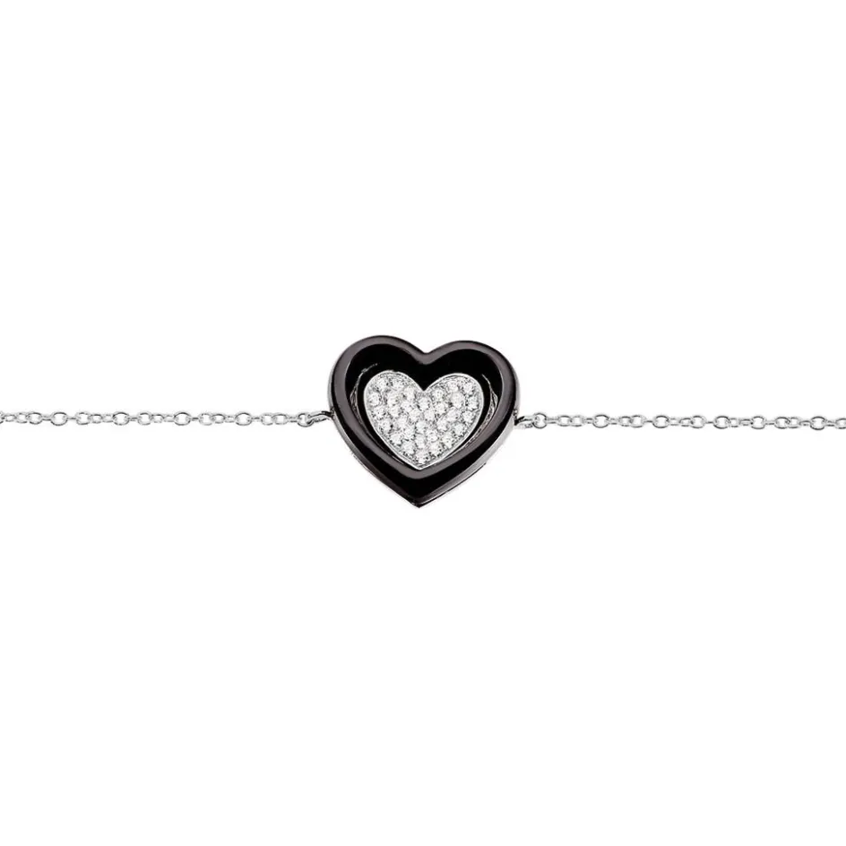 Bracelet Argent Blanc 925/1000 Forme Coeur Ceramique Noire Et Oxydes De Zirconium 18.5cm