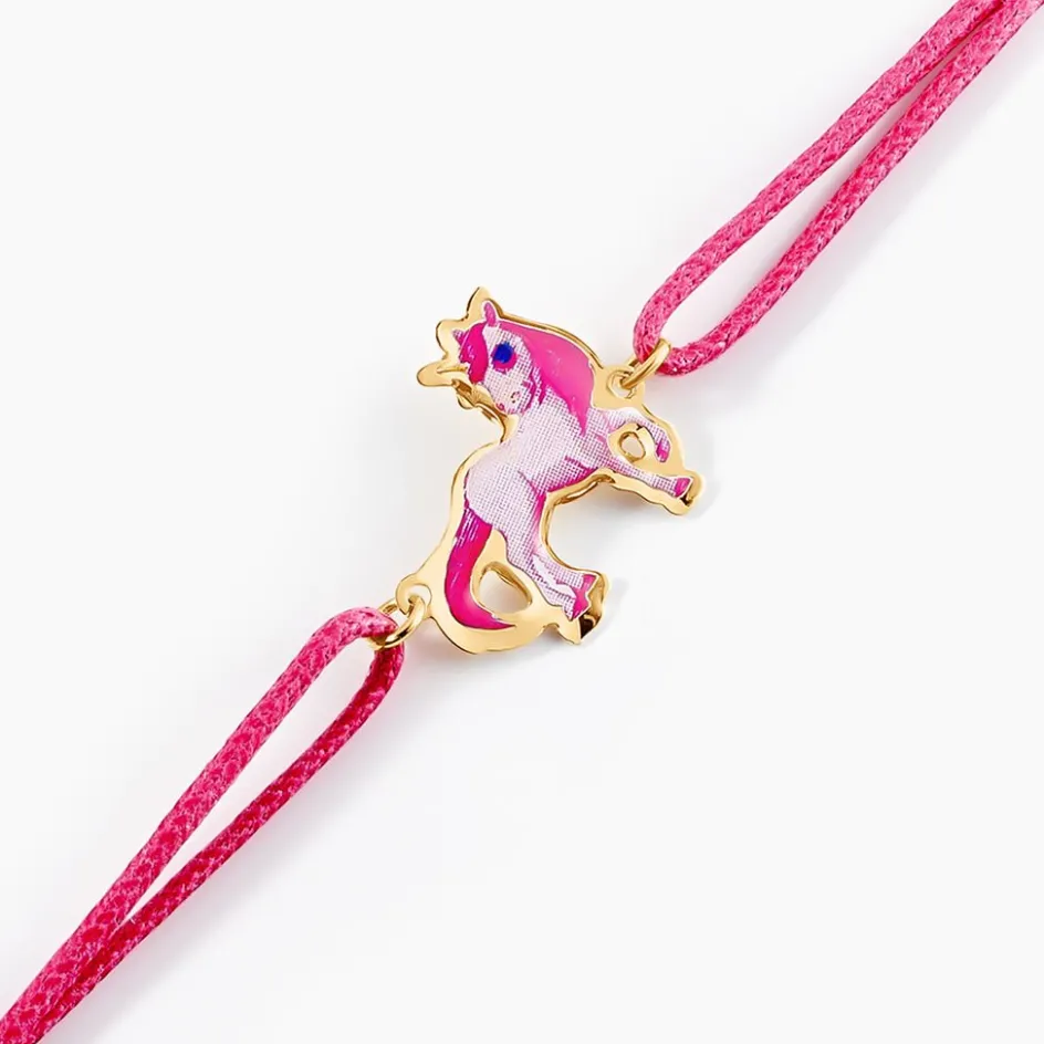 Bracelet Or Jaune 375/1000 Motif Poney Smalto Rose Cordon Rose