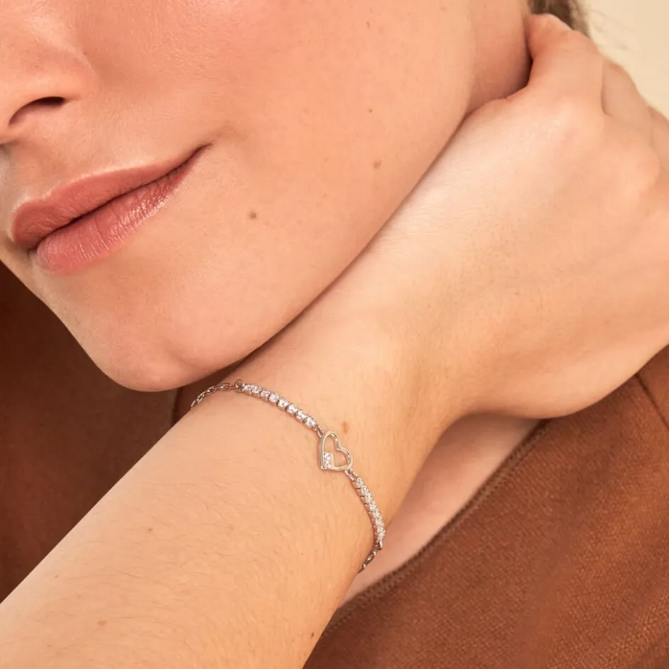 Bracelet Argent Blanc 925/1000 C艙ur Effet Riviere Oxydes De Zirconium Maille Forçat 16+3cm