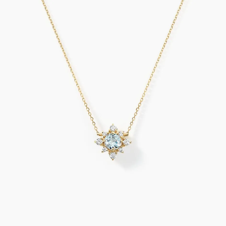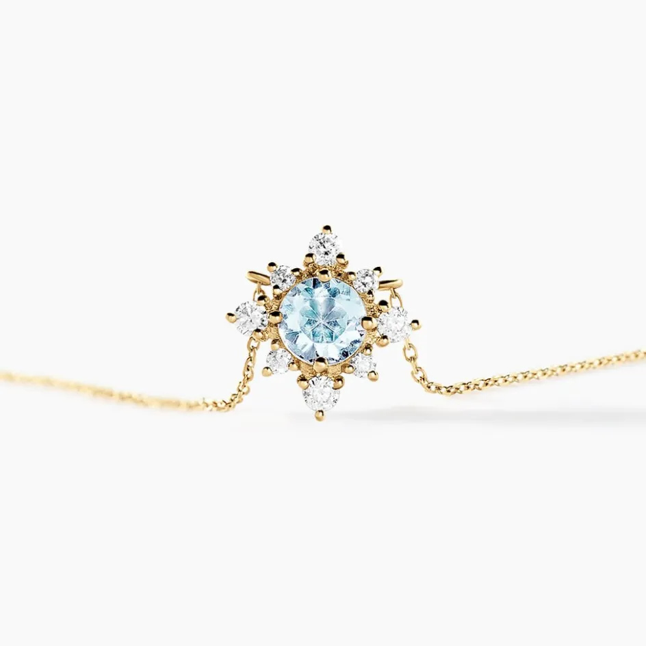 Collier Or Jaune 375/1000 Fleur Topaze Bleu Sky Centrale 0.67cts Serti Griffes Accompagnee D’oxyde De Zirconium Maille Forcat 40+2cm