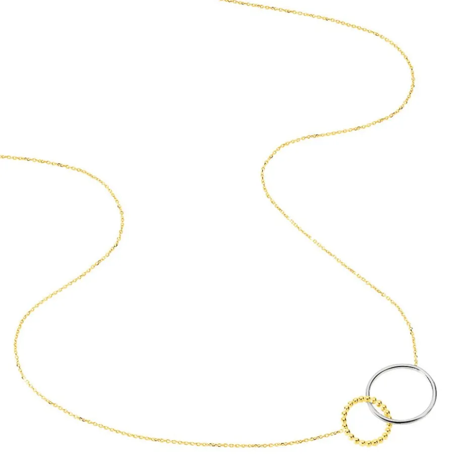 Collier Or Bicolore 375/1000 Double Cercles Ajoures Effet Perlé Et Lisse Maille Jaseron 42cm