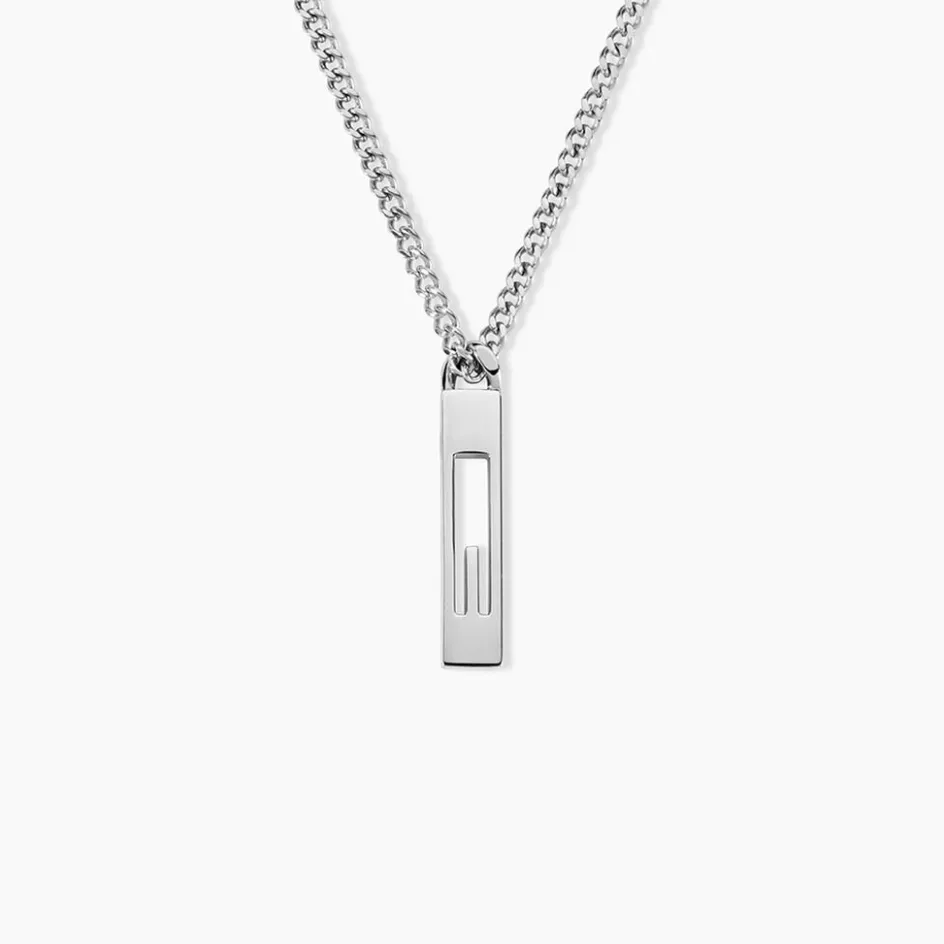 Collier Acier Inoxydable Blanc Rectangle Motif Découpé Maille Forcat Largeur 4Mm 50+5Cm