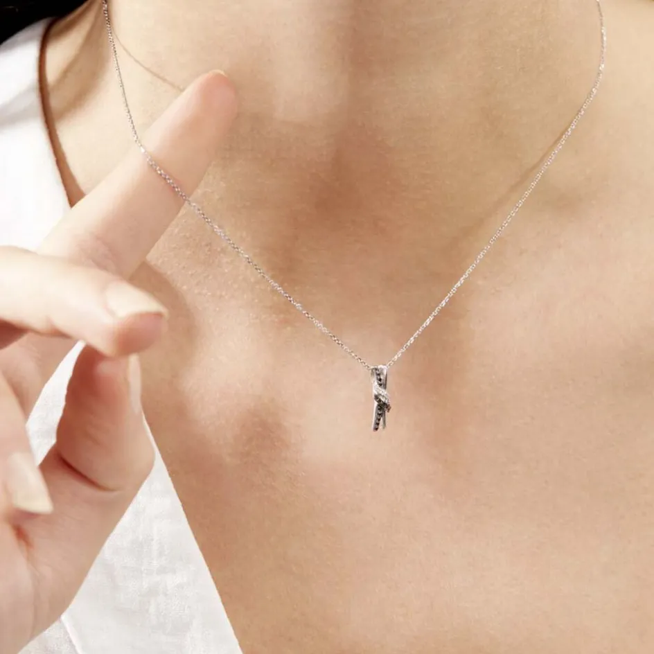 Collier Or Blanc 375/1000 Noeud Pave Diamants Et Blancs Diamants Noirs 42cm
