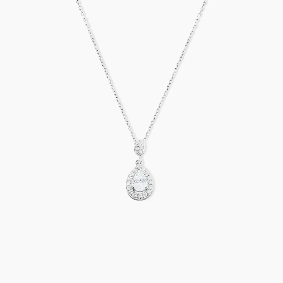 Collier Or Blanc 375/1000 Oxyde De Zirconium Blanc 0.68cts Serti Griffes Forme Poire Entourage Oxydes 40+2cm