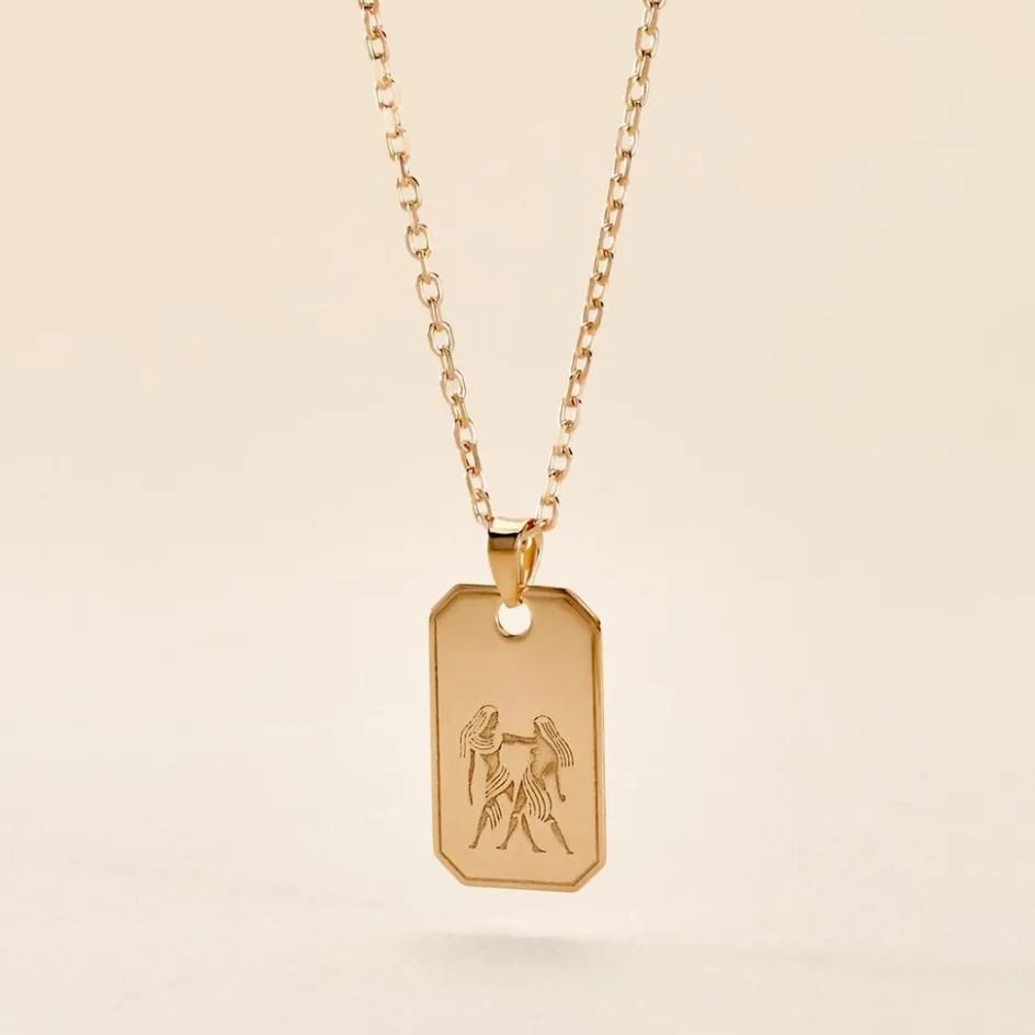 Collier Plaqué Or Jaune Plaque Gravee Signe Astrologique Gemeaux Maille Forcat 50cm
