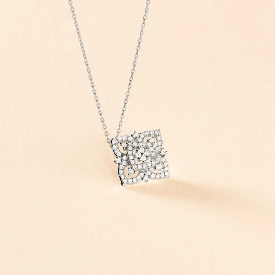 Collier Or Blanc 375/1000 Fleur Diamants Ronds 0.18cts Micro Serti Maille Forçat Ronde 40+2cm
