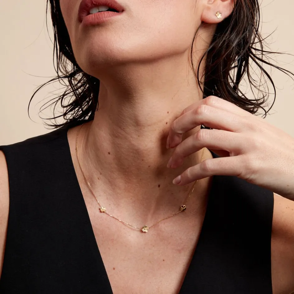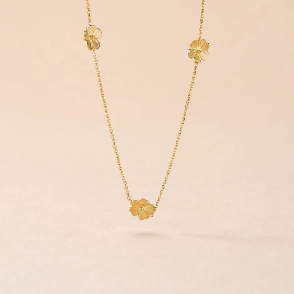 Collier Or Jaune 375/1000 3 Fleurs Ciselees Maille Jaseron 40+2cm