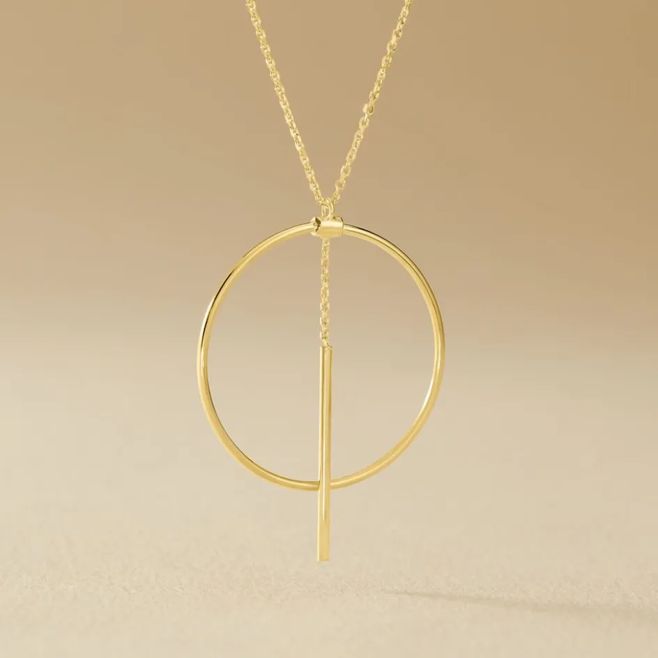 Collier Or Jaune 375/1000 Cercle Ajoure + Petite Barre Pendante Maille Jaseron 42cm