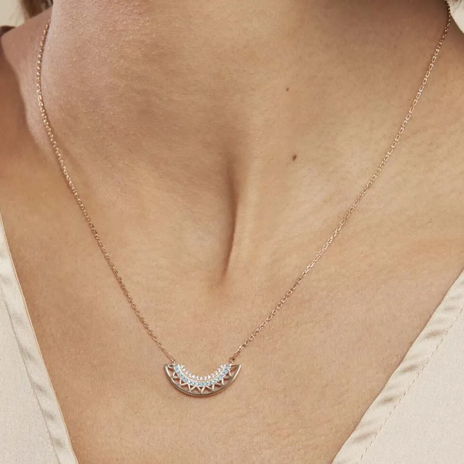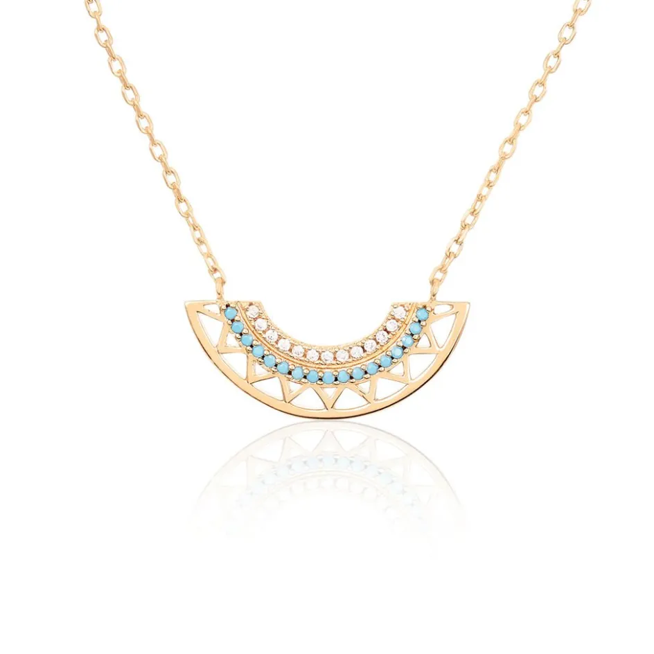 Collier Plaqué Or Jaune Motifs Mexicains Ajoures Oxydes De Zirconium Et Pierres Bleues 45cm