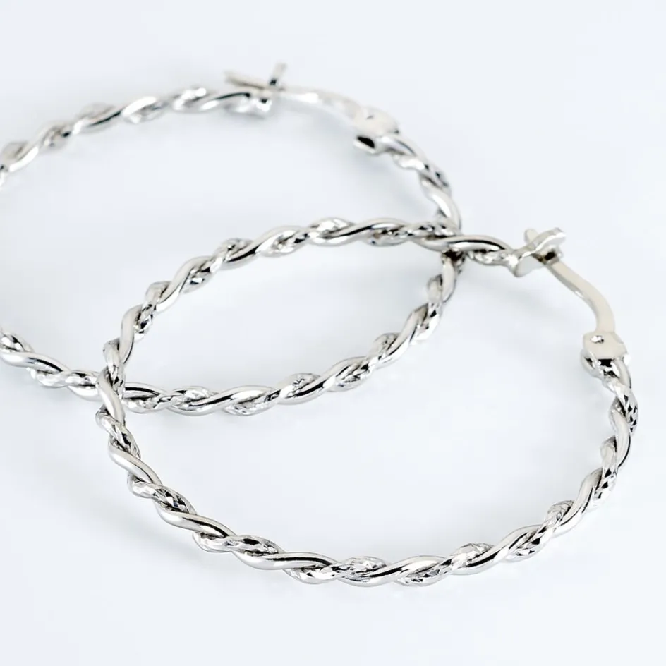 Créoles Argent Blanc 925/1000 Effet Torsade Fil Diamante Et Fil Lisse Largeur 2mm Diametre 30mm
