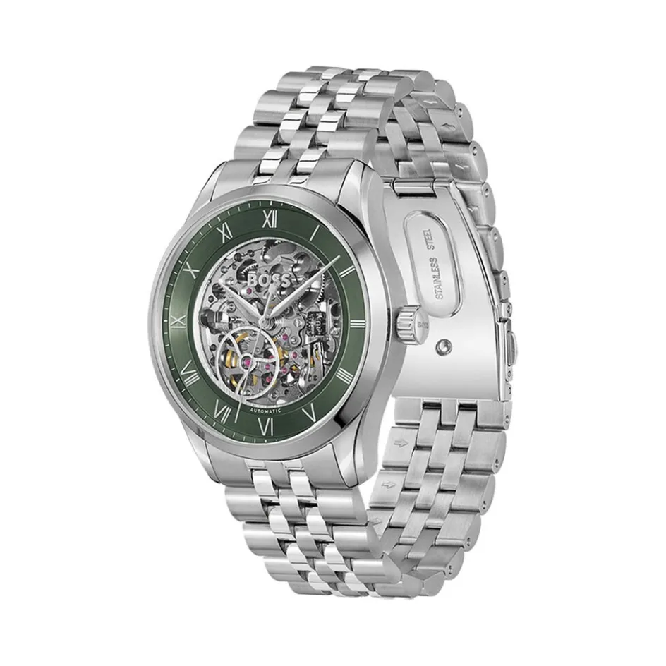 Montre Boss Principle Skeleton Acier Argente Ronde Automatique 41mm C艙ur Ouvert Fond Vert Fonce Bracelet Acier Argente 1514236