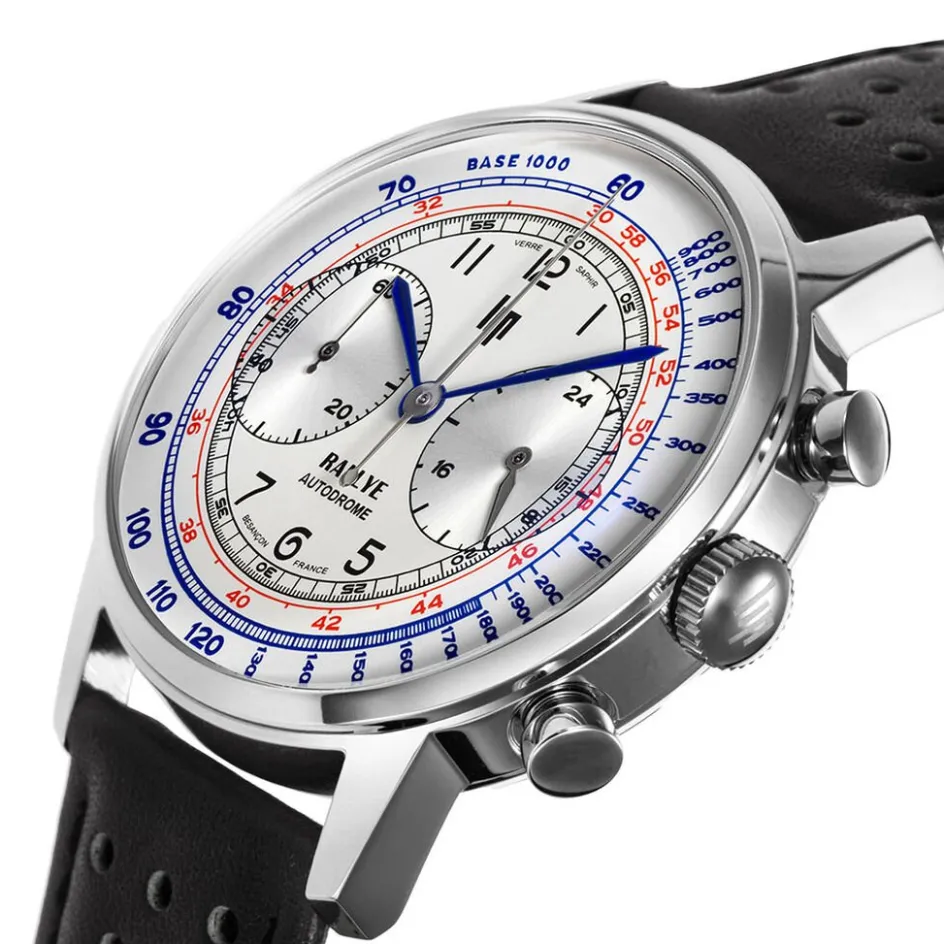 Montre Lip Rallye Autodrome Acier Inoxydable Argenté Meca Quartz Chronographe Ronde 40Mm Fond Argenté Bracelet Cuir De Veau Ajoure Noir 671828