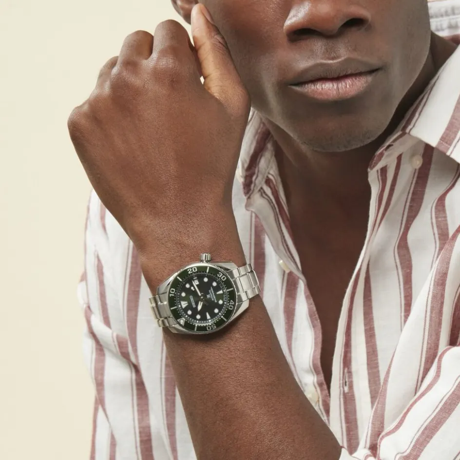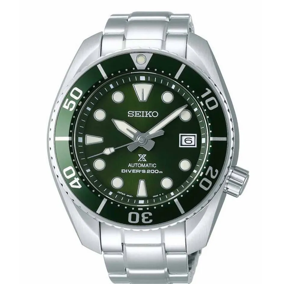 Montre Seiko Prospex Acier Blanc Ronde Quartz Automatique 45mm Fond Vert Bracelet Acier Blanc Spb103j1