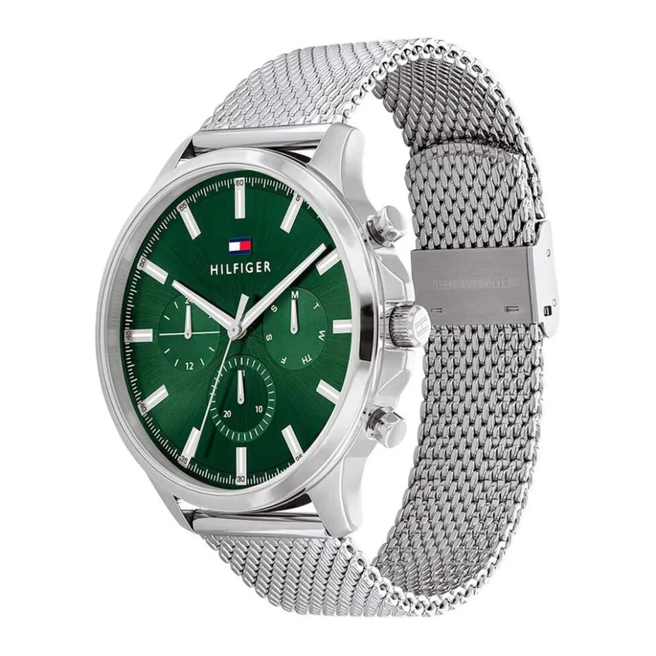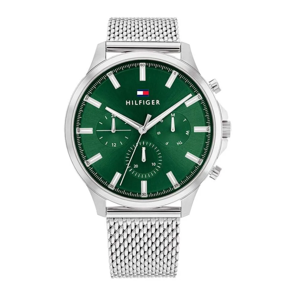 Montre Tommy Hilfiger Ryder Acier Ronde Quartz 44mm Fond Vert Bracelet Acier Maille Milanaise 1710499