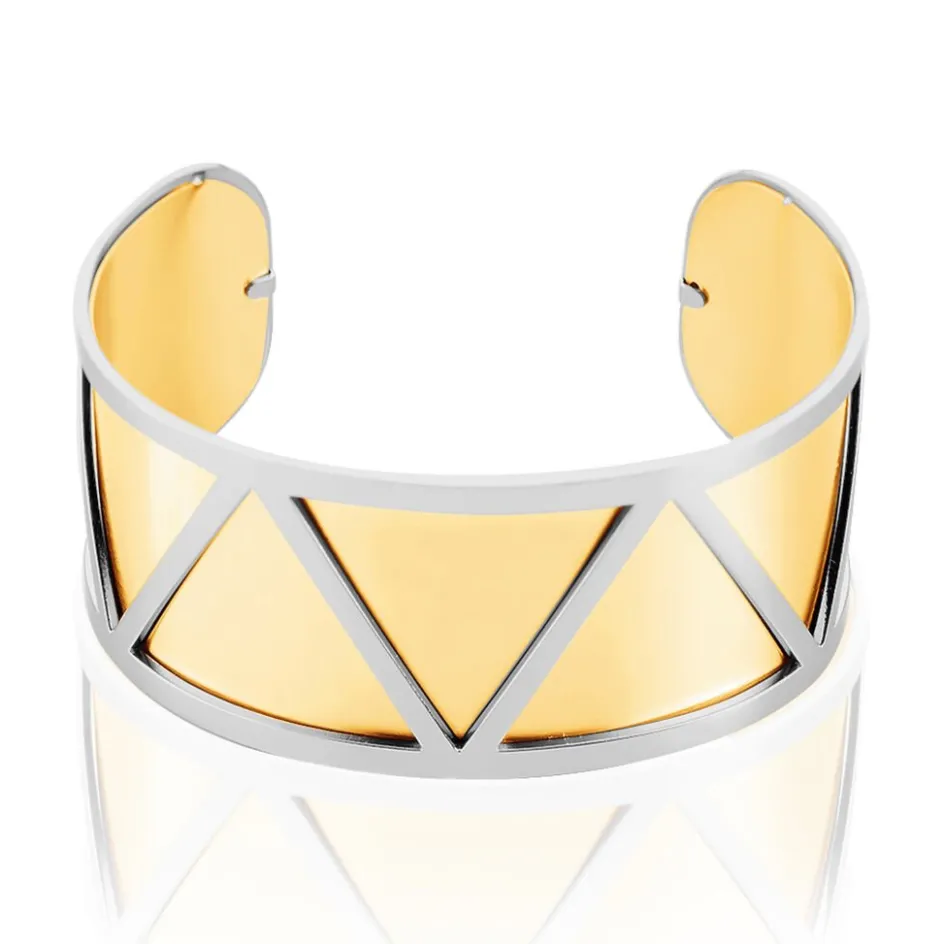 Barcelet Jonc Motifs Triangles Ajoures + Plaque Acier Dore