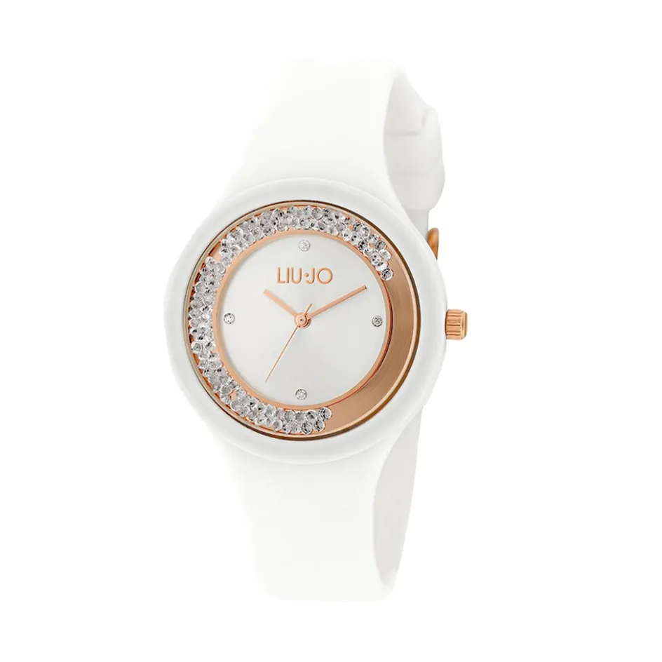 Montre Liu Jo Dancing Sport Acier Noir Ronde Quartz 36mm Entourage Strass Fond Blanc Bracelet Silicone Blanc