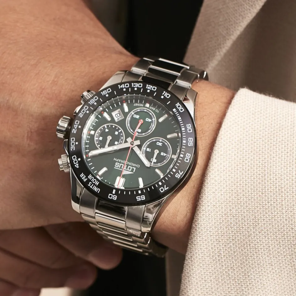 Montre Lotus Freedom Collection Acier Argente Ronde Quartz Chronographe 43.5mm Lunette Noire Fond Vert Bracelet Acier 18912/5