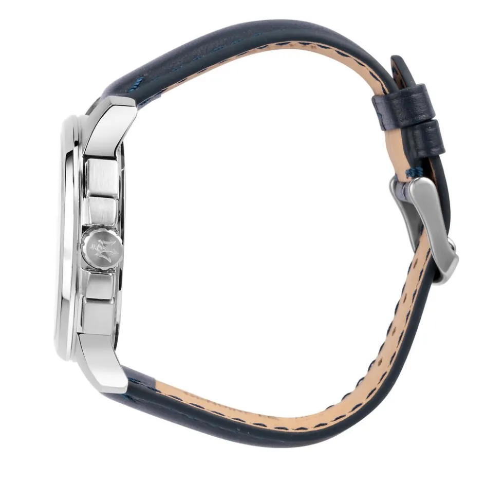 Montre Maserati Successo Acier Argenté Ronde Quartz 44mm Fond Bleu Bracelet Cuir De Vache Bleu R8851121003