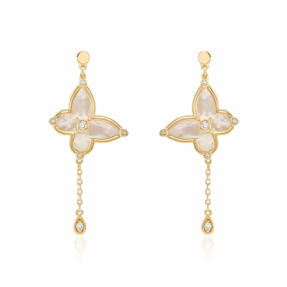 Boucles D’oreilles Pendantes Plaqué Or Papillons Nacres Blanches Oxydes De Zirconium