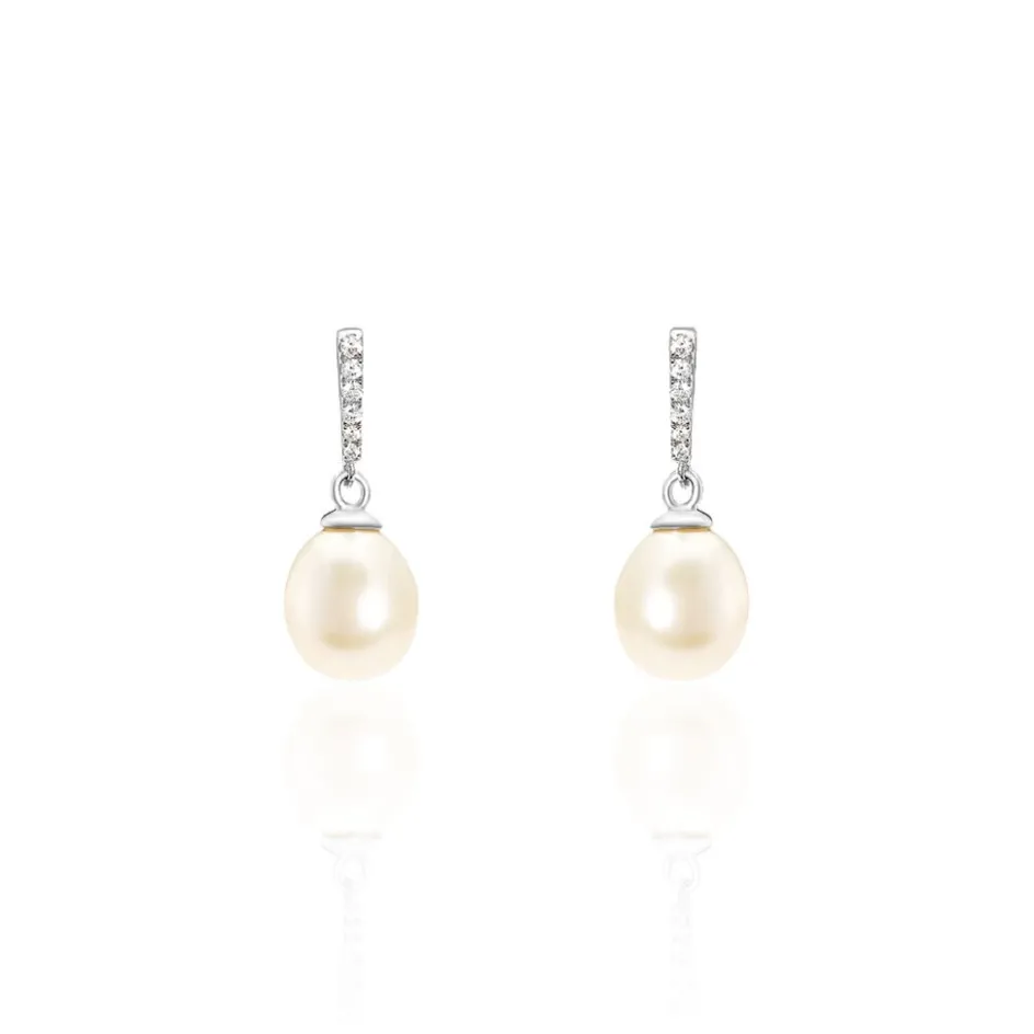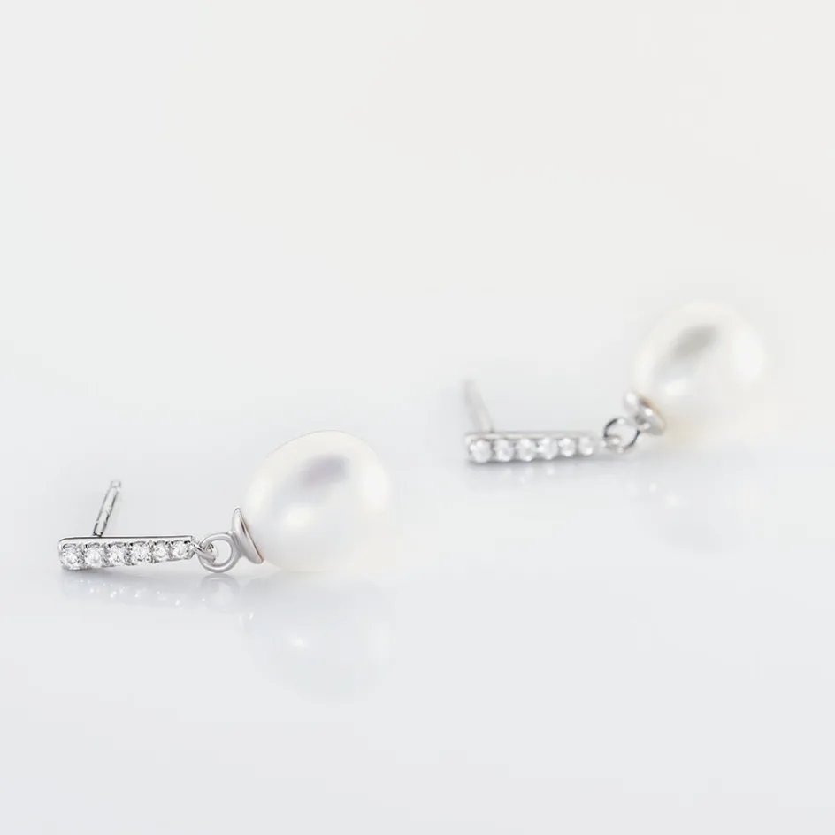 Boucles D’oreilles Pendantes Argent Blanc 925/1000 Perles De Culture Blanches 8/8.5mm Oxydes De Zirconium