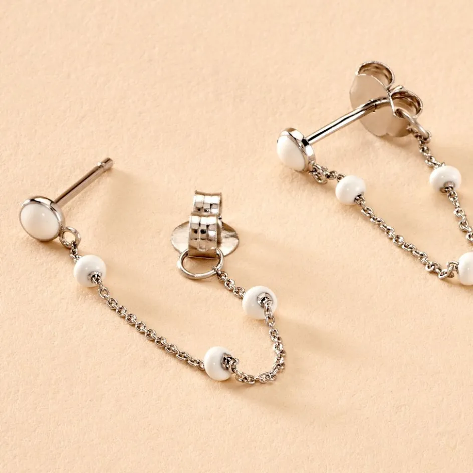 Boucles D’oreilles Pendantes Argent Blanc 925/1000 Email Blanc Maille Forçat 4.3cm
