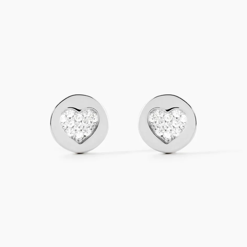 Boucles D’oreilles Puces Argent Blanc 925/1000 Pastilles Pavage C艙ur