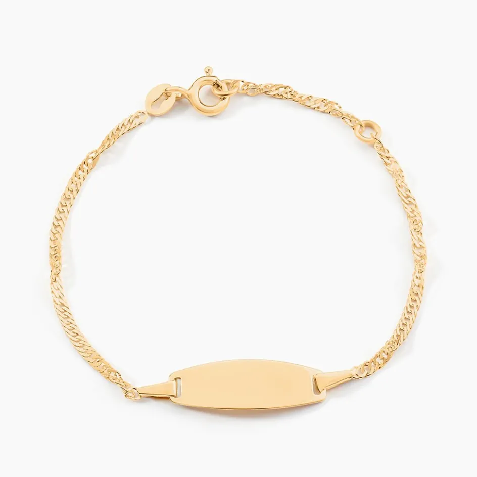 Bracelet Identite Bebe Or Jaune 375/1000 Plaque Ovale Maille Singapour 13.5cm