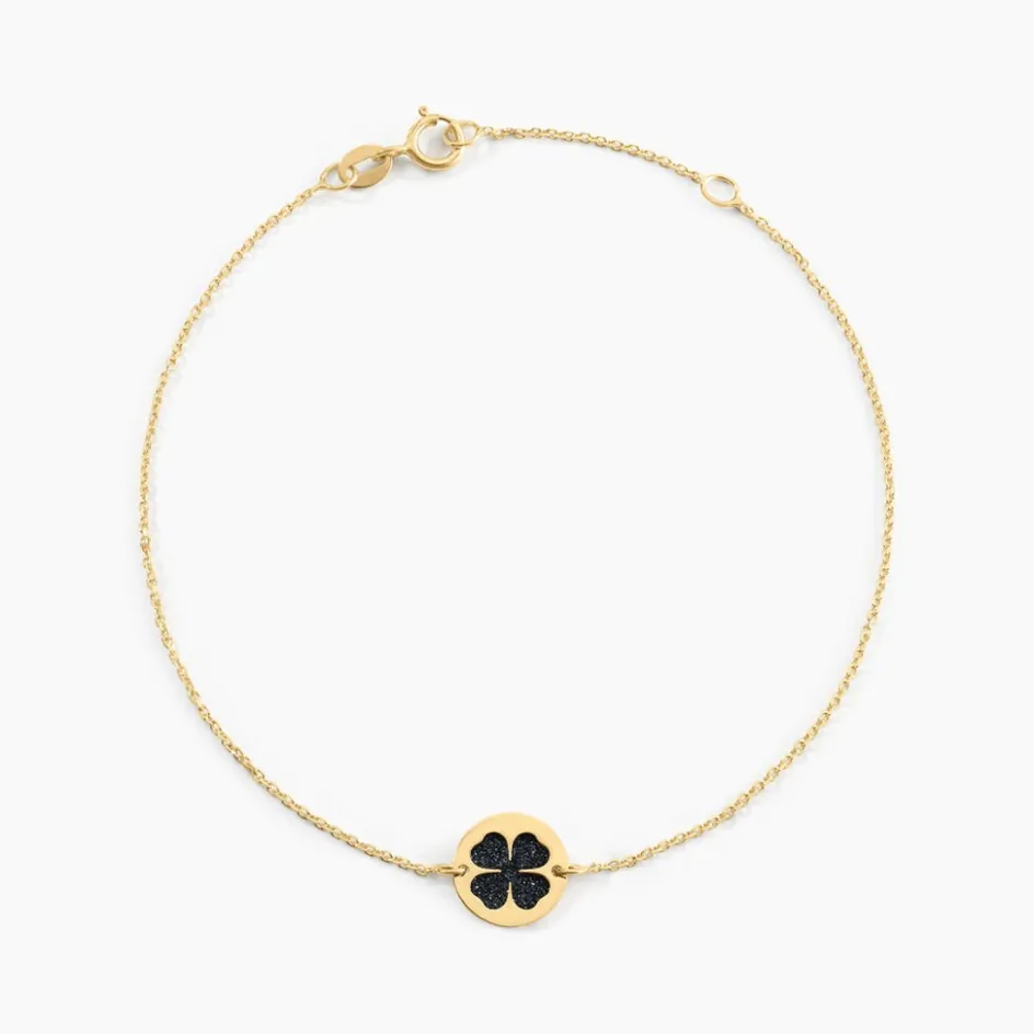 Bracelet Or Jaune 375/1000 Pastille Glitter Noir + Pastille Ajouree Motif Trefle Maille Jaseron 16+2cm