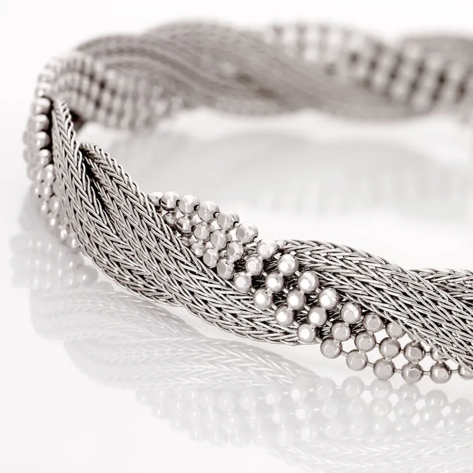 Bracelet Argent Blanc 925/1000 Maille Entrelacee Filet Et Boule Diamante 21cm