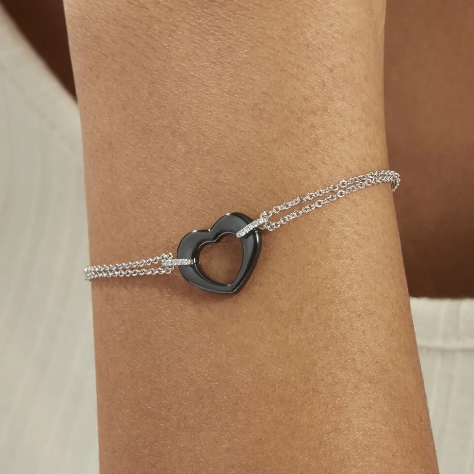 Bracelet Argent Blanc 925/1000 Coeur Ceramique Noire Et Oxydes De Zirconium Chaine Double 19cm
