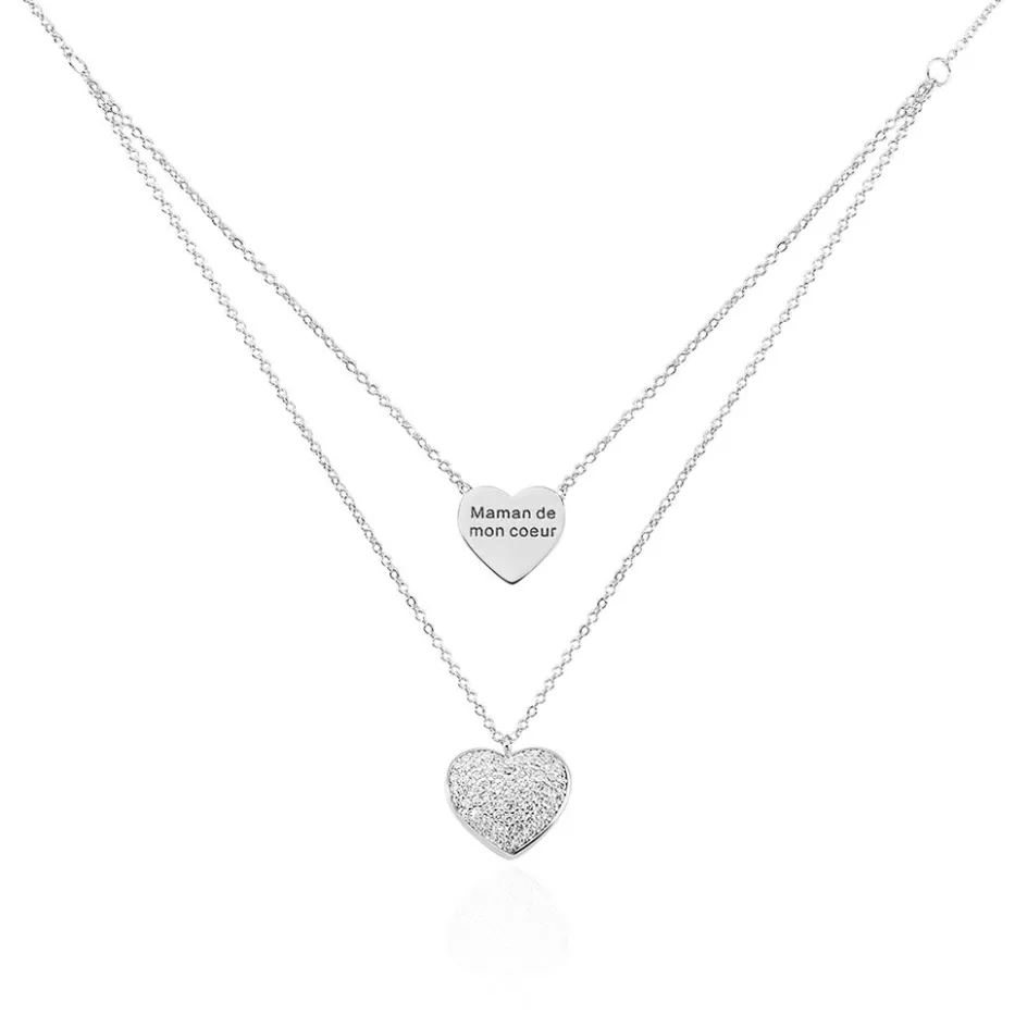 Collier Argent 925/1000 Double Chaines Motifs C艙ur Pavage Oxydes De Zirconium Et C艙ur Message 45cm