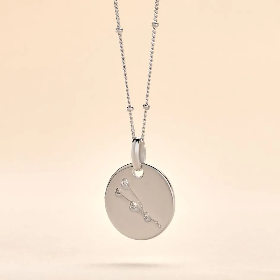 Collier Argent 925/1000 astr Pastille Zodiaque Taureau Sertis Clos Oxydes De Zirconium Maille Forcat Et Boules 50cm
