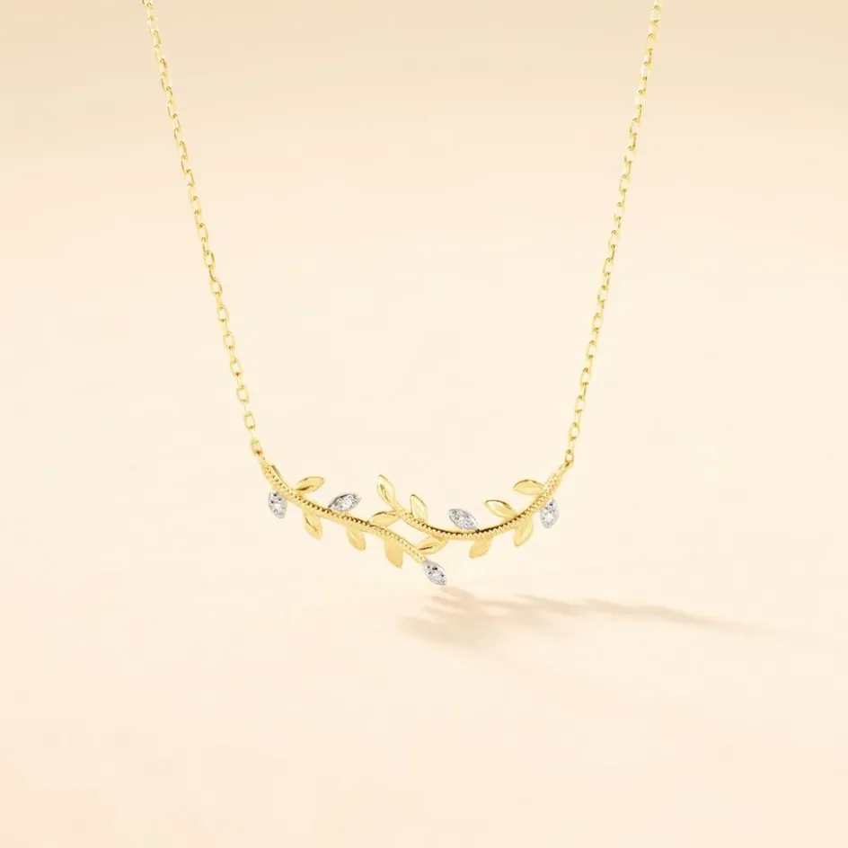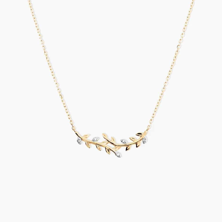 Collier Or Jaune 375/1000 Feuilles Semi Pavage Diamants Ronds Maille Forcat 40+2cm