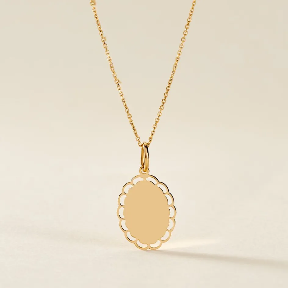Pendentif Or Jaune 375/1000 Plaque Gravable Ovale Contour Dentele Ajoure