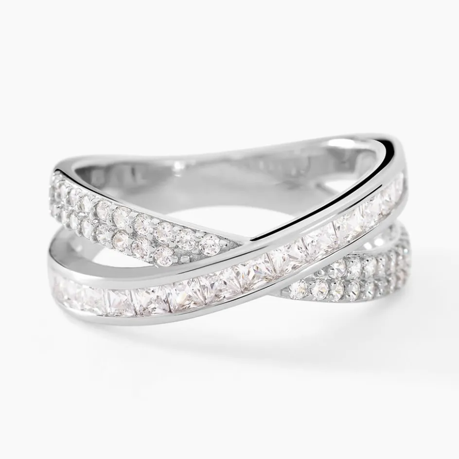 Bague Argent Blanc 925/1000 Croise Micro Setting Oxydes De Zirconium Ronds Et Taille Baguette