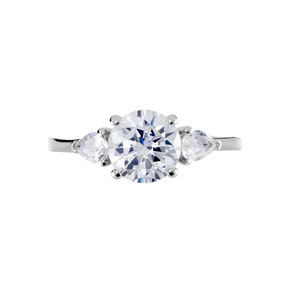 Bague Or Blanc 375/1000 Oxyde De Zirconium Central Forme Ronde + Oxydes De Zirconium Formes Poires