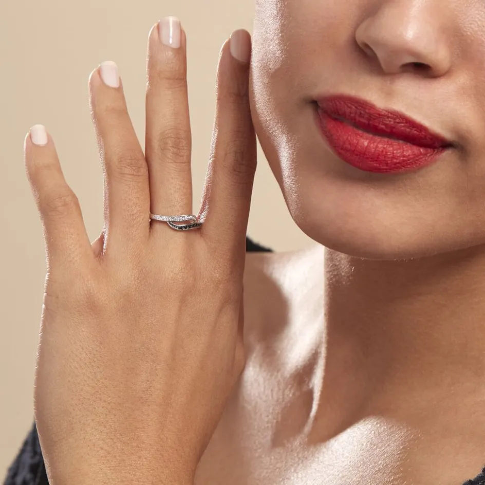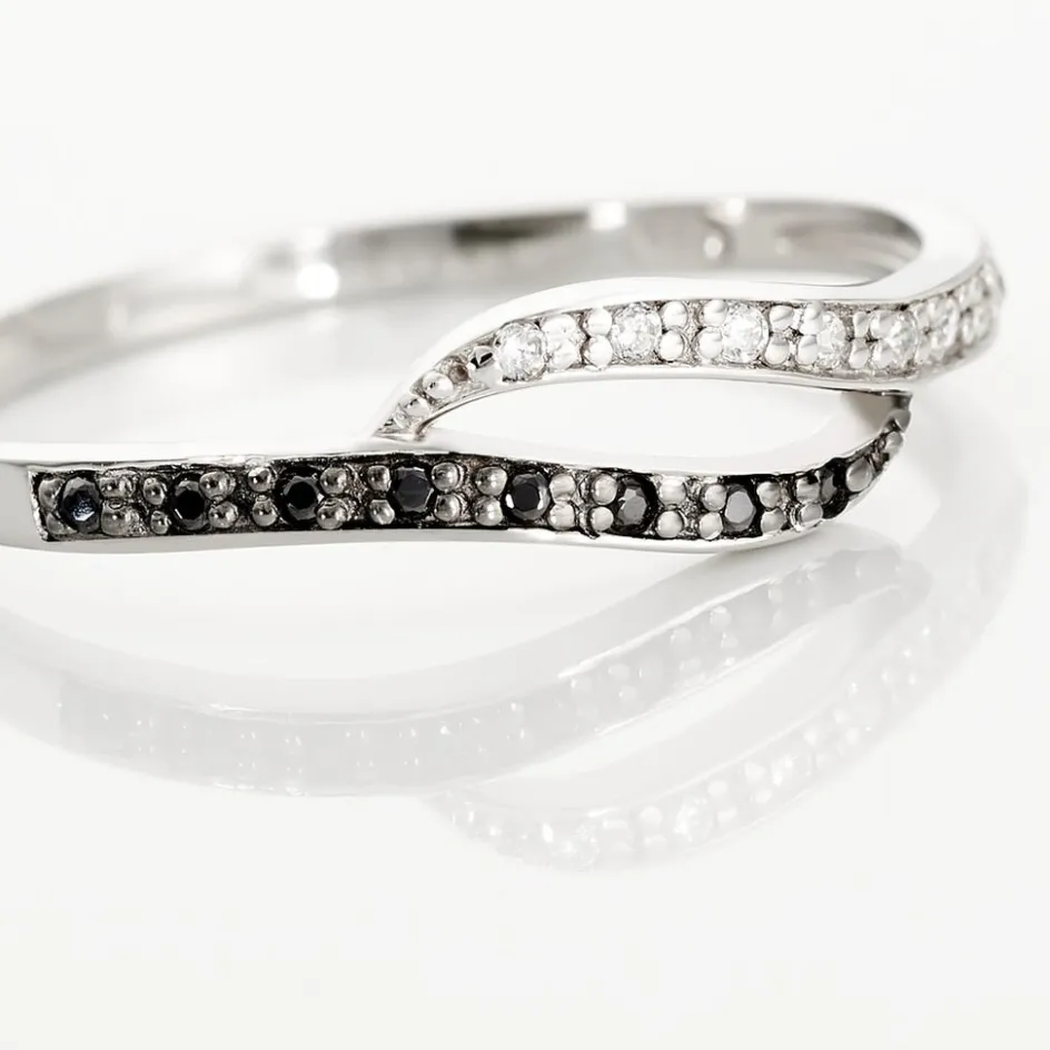 Bague Argent Blanc 925/1000 Forme Vague Pavage Oxydes De Zirconium Noirs Et Blancs