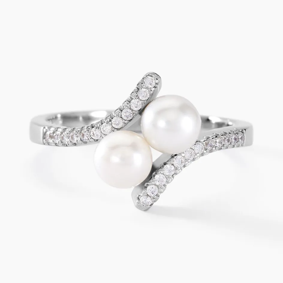 Bague Argent Blanc 925/1000 Toi Et Moi Perles De Culture Accompagné Oxydes De Zirconium
