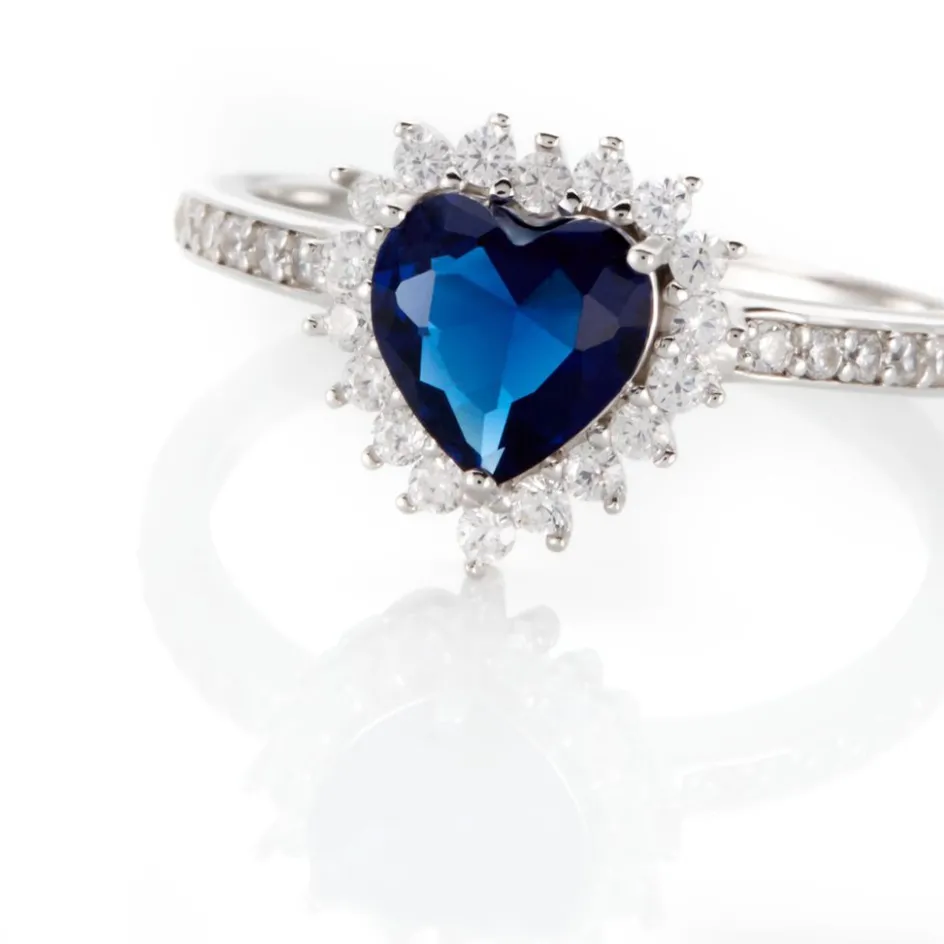 Bague Argent Blanc 925/1000 C艙ur De L’ocean Serti Griffes Pierre Artificielle Bleue Entourage Oxydes De Zirconium