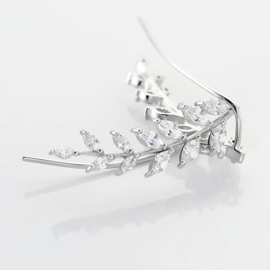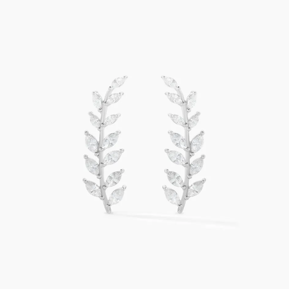 Boucles D’oreilles Grimpantes Argent Blanc 925/1000 Motifs Feuilles Oxydes De Zirconium