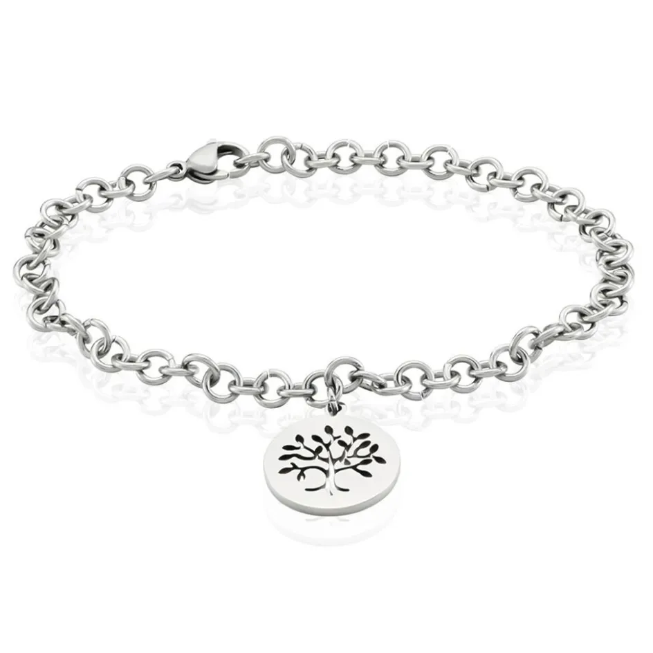 Bracelet Acier Blanc Pendentif Arbre De Vie Maille Forçat Epaisse 21cm