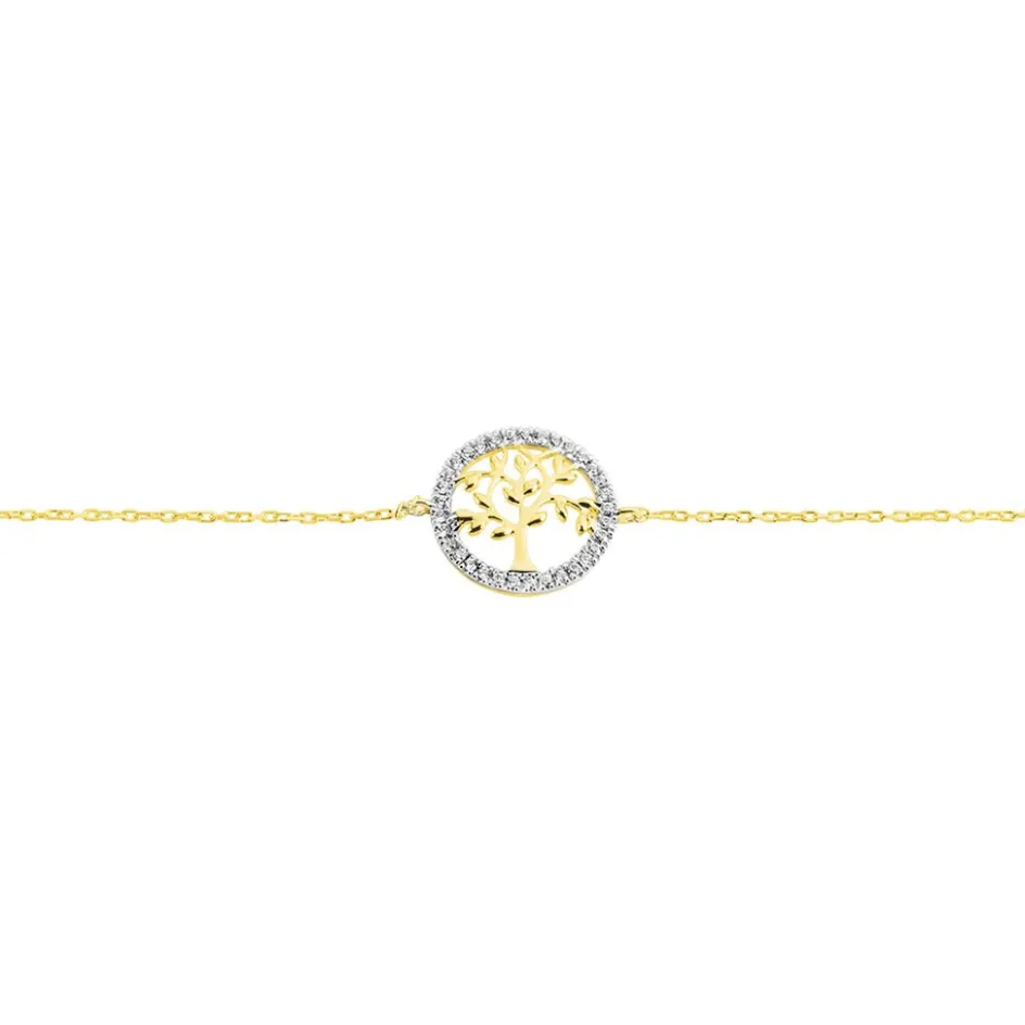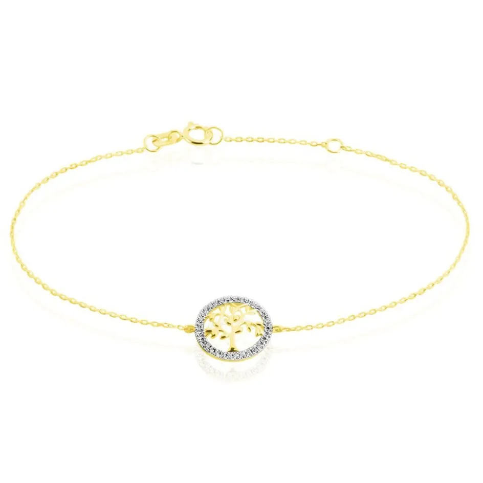 Bracelet Or Jaune 375/1000 Arbre De Vie Micro Pavage Oxydes De Zirconium Maille Forçat 16+2cm