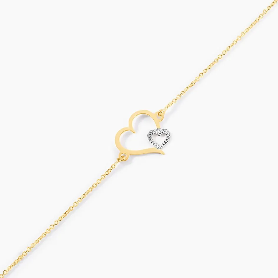 Bracelet Or Bicolore 375/1000 Double C艙urs Ajoures Avec 1 C艙ur Argente Penche Effet Fantaisie Maille Jaseron 18cm