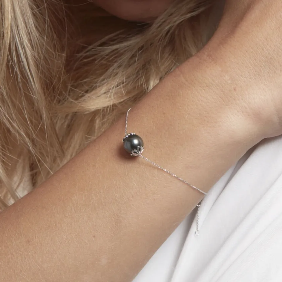 Bracelet Or Jaune 375/1000 Perle De Culture De Tahiti 9/9.5mm Ronde Motif Floral Ajoure 20cm