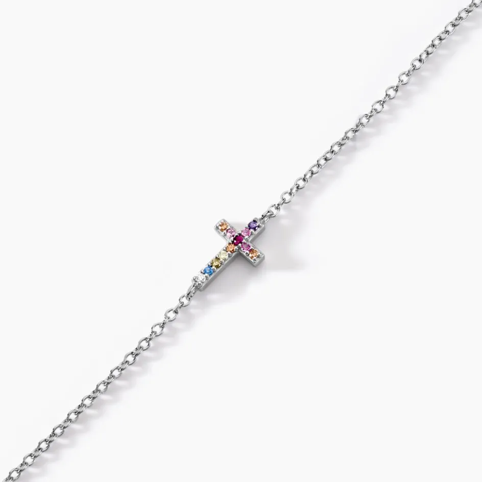 Bracelet Argent 925/1000 haïvy Croix Pavage Oxydes De Zirconium Multicolore Maille Forcat 16+3cm