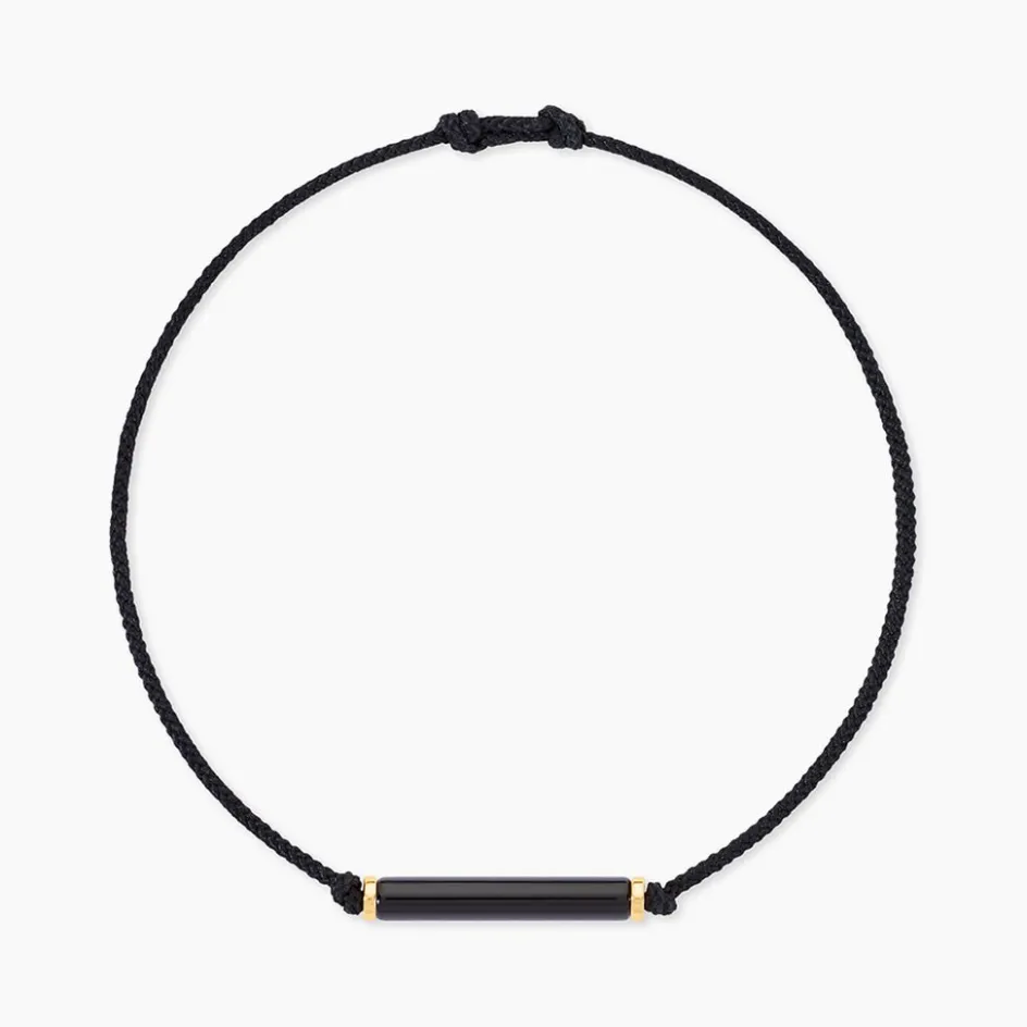 Bracelet Or Jaune 375/1000 Cylindre Onyx Cordon Nylon Noir 28Cm Ajustable