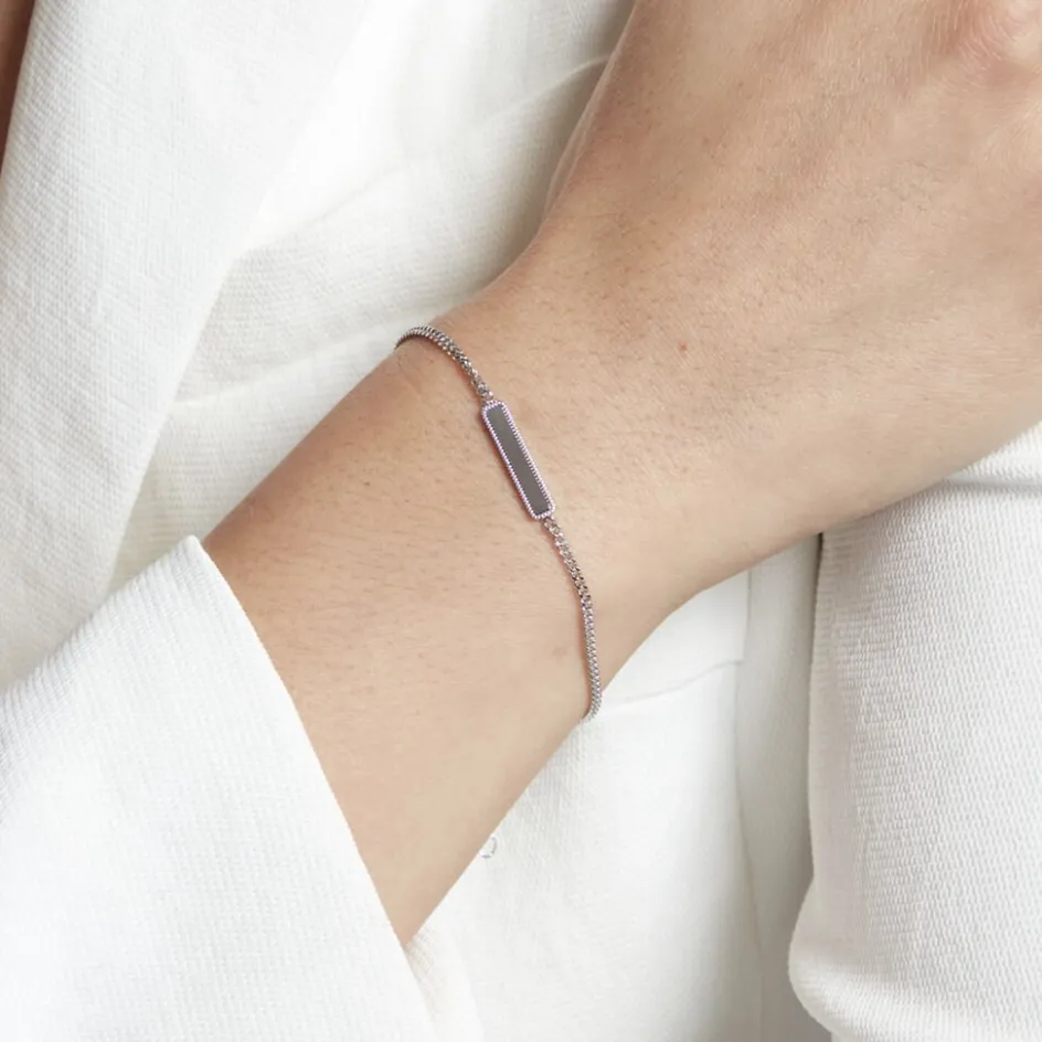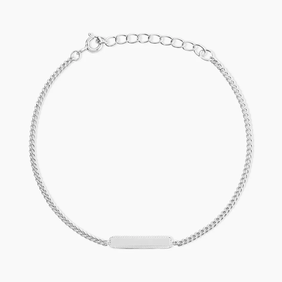 Bracelet Argent Blanc 925/1000 Plaque Rectangulaire Bordures Perlees Maille Gourmette 19cm