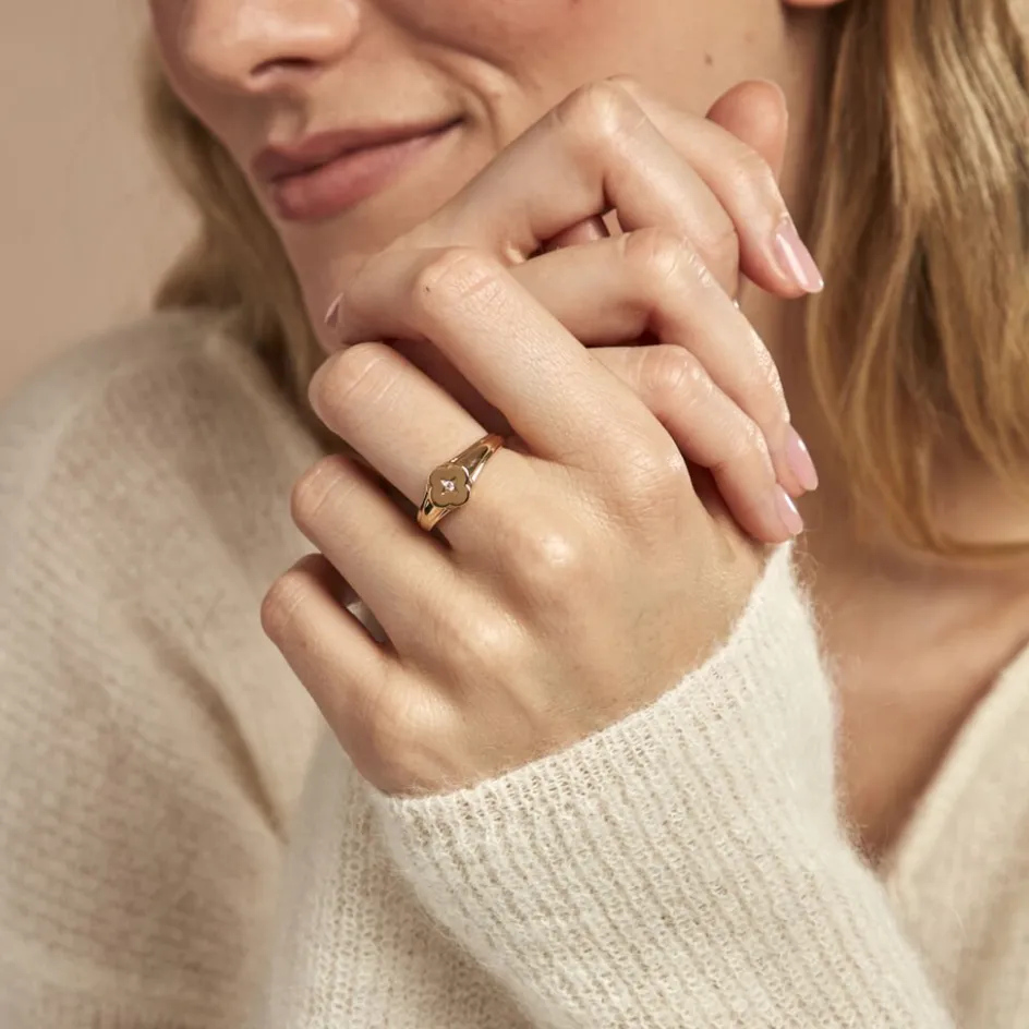 Chevalière Plaqué Or Jaune Plateau Forme Trèfle Oxydes De Zirconium