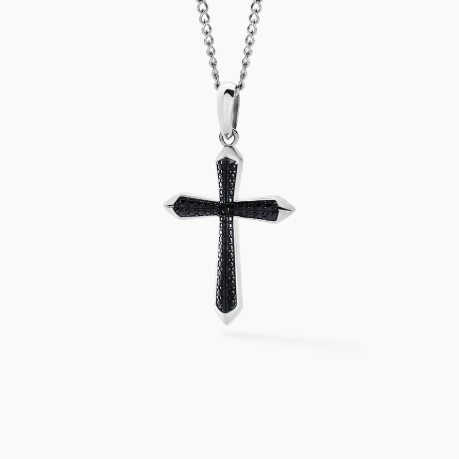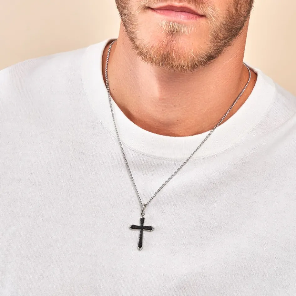 Collier Acier Inoxydable Bicolore Croix Noire Effet Empierre Maille Gourmette Largeur 2mm 55cm